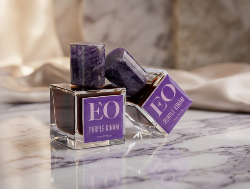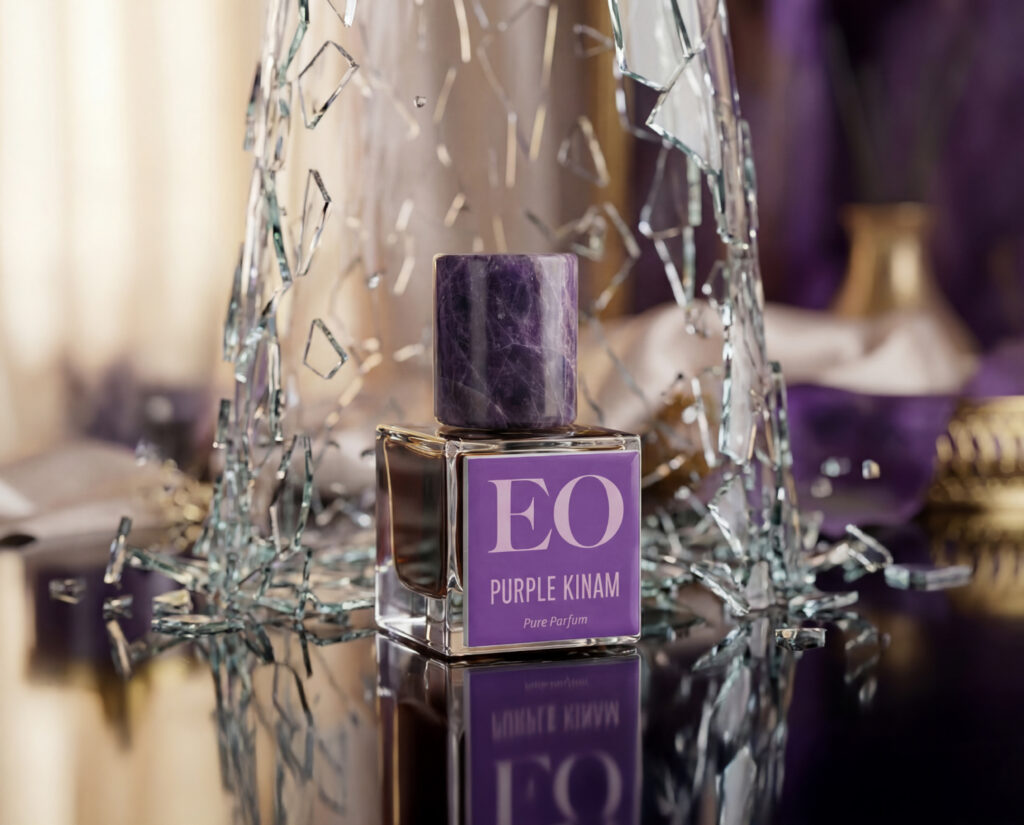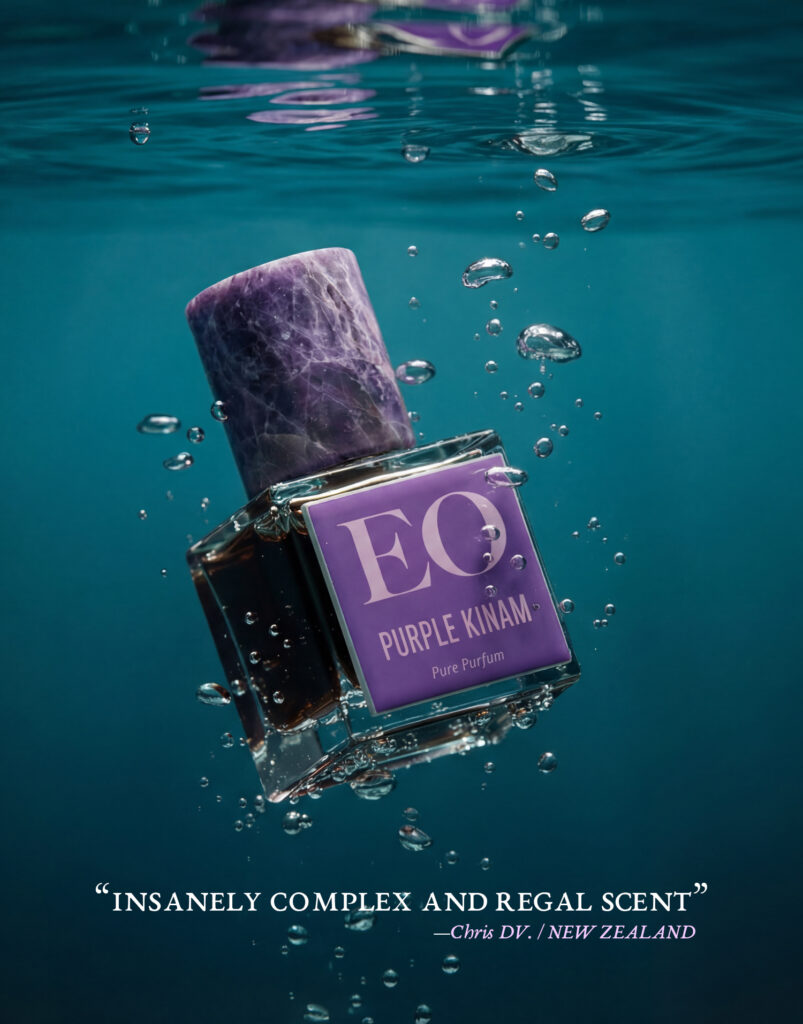 The scent of Purple Kinam doesn’t let you delve down a scent breakdown. Instead, you smell the voluptuous, purple body of the oud that makes up the composition, lacquered in tens of other ingredients not meant to be note-picked or analyzed but smelled, all in one go… Slowly, deliberately punctuating the aroma in a thousand petals of resin abuzz with the nectar of purple alien bees on the tail of Space X’s spaceship as it re-entered space…