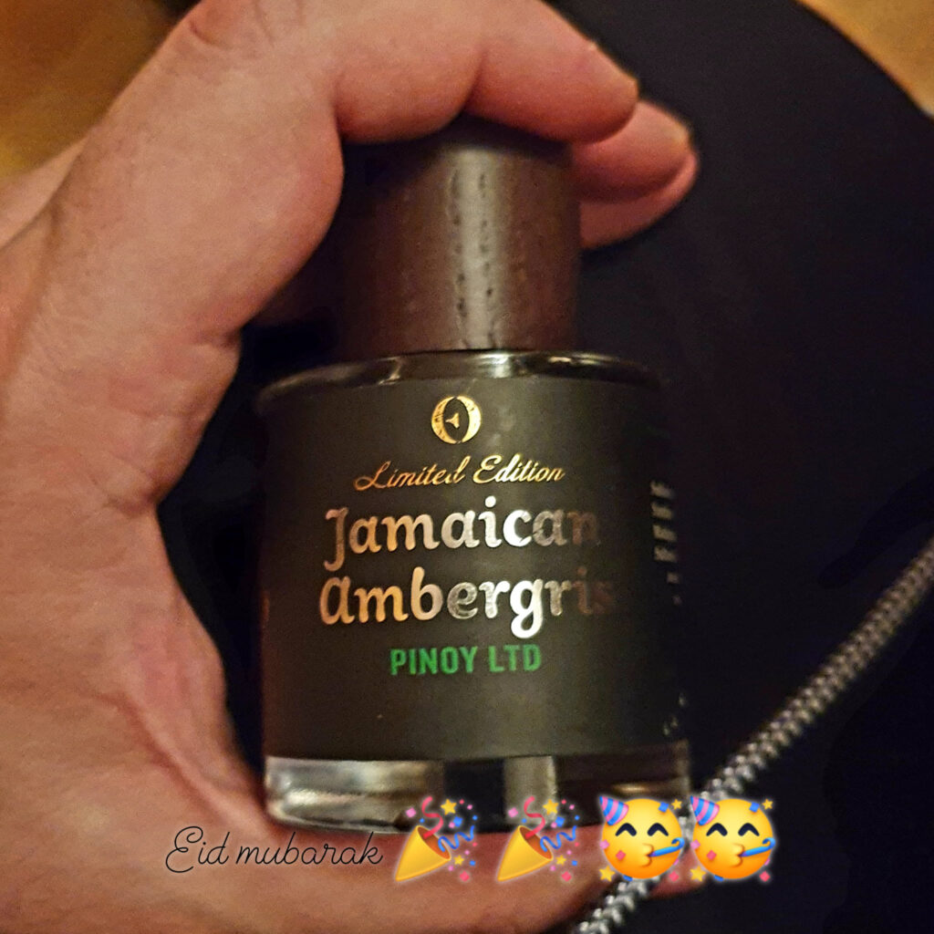 Celebrating Eid it with no other than the beautiful Jamaican Ambergris Pinoy LTD. This composition starts with a huge shot of ambergris paired with a lot of tart-floral notes. Pinoy LTD does this scent justice, giving it a touch of smokeness. It transforms the scent into salty sea air but sandalwood takes it into the sweet side. Wonderful! Owning Maroke SQ too, I can easily say that you gonna be satisfied with both. Grab a bottle guys while it’s still on sale!