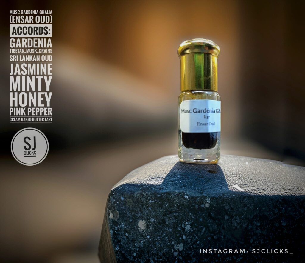 Musc Gardénia Ghalia, a luxurious fragrance, blends gardenia and musk with rare Sri Lankan oud.s Enhanced by jasmine, mint, honey, and pink pepper, it features Royal Tibetan Musk grains for depth. With layers of walla patta’s floral coolness and a touch of cream baked butter tart sweetness, this opulent scent unfolds in waves of complexity, fit for royalty.