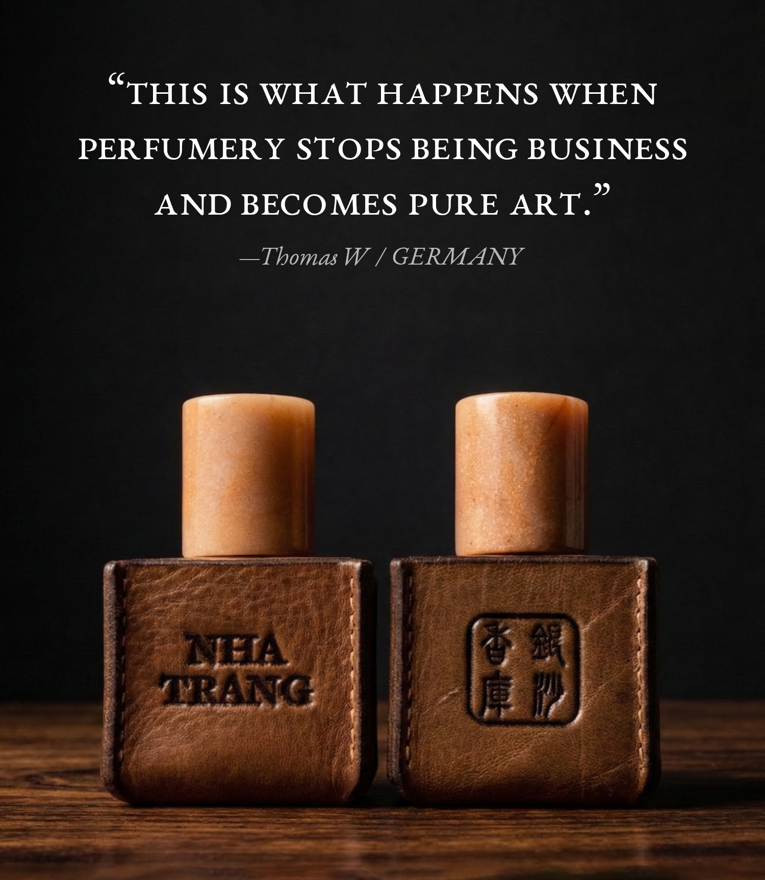 Nha Trang saturates the perfume first – bitter, narcotic, edged with that medicinal kyara bite. Then Ya Chuan follows, pouring golden Vietnamese resin through the bouquet.